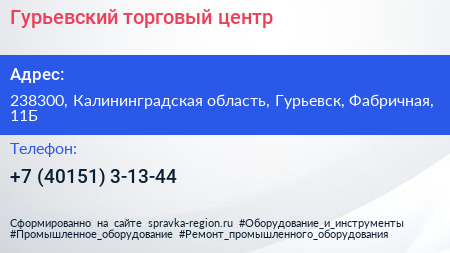 Гурьевский, торговый центр по адресу 238300, Калининградская область, Гурьевск, Фабричная, 11Б в дальнейшем Организация, размещена в следующих категориях: