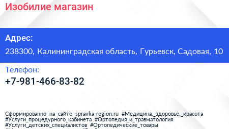 Изобилие, магазин по адресу 238300, Калининградская область, Гурьевск, Садовая, 10 в дальнейшем Организация, размещена в следующих категориях: