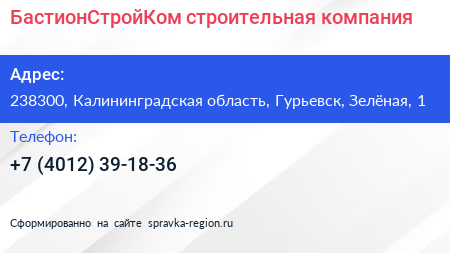 БастионСтройКом, строительная компания по адресу 238300, Калининградская область, Гурьевск, Зелёная, 1 в дальнейшем Организация, размещена в следующих категориях: