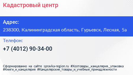 Кадастровый центр по адресу 238300, Калининградская область, Гурьевск, Лесная, 5а в дальнейшем Организация, размещена в следующих категориях: