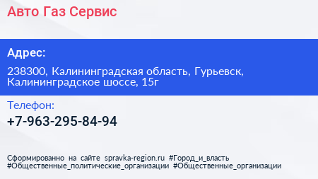 Авто Газ Сервис по адресу 238300, Калининградская область, Гурьевск, Калининградское шоссе, 15г в дальнейшем Организация, размещена в следующих категориях: