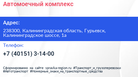 Автомоечный комплекс по адресу 238300, Калининградская область, Гурьевск, Калининградское шоссе, 1а в дальнейшем Организация, размещена в следующих категориях: