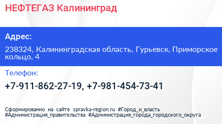 НЕФТЕГАЗ Калининград по адресу 238324, Калининградская область, Гурьевск, Приморское кольцо, 4 в дальнейшем Организация, размещена в следующих категориях: