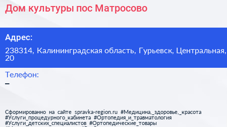 Дом культуры, пос. Матросово по адресу 238314, Калининградская область, Гурьевск, Центральная, 20 в дальнейшем Организация, размещена в следующих категориях: