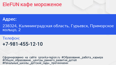 EleFUN, кафе-мороженое по адресу 238324, Калининградская область, Гурьевск, Приморское кольцо, 2 в дальнейшем Организация, размещена в следующих категориях: