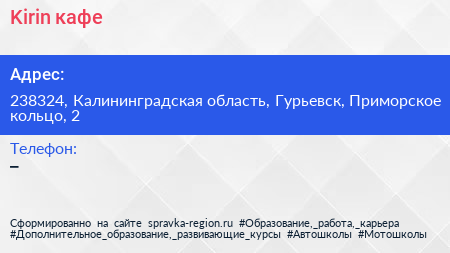 Kirin, кафе по адресу 238324, Калининградская область, Гурьевск, Приморское кольцо, 2 в дальнейшем Организация, размещена в следующих категориях:
