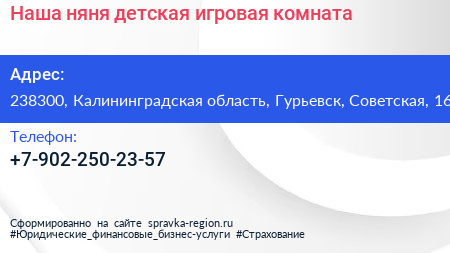 Наша няня, детская игровая комната по адресу 238300, Калининградская область, Гурьевск, Советская, 16 в дальнейшем Организация, размещена в следующих категориях:
