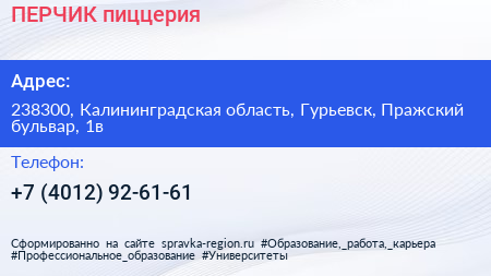 ПЕРЧИК, пиццерия по адресу 238300, Калининградская область, Гурьевск, Пражский бульвар, 1в в дальнейшем Организация, размещена в следующих категориях: