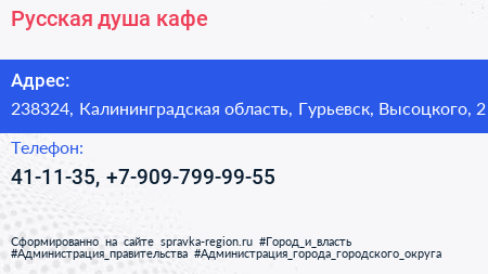 Русская душа, кафе по адресу 238324, Калининградская область, Гурьевск, Высоцкого, 2 в дальнейшем Организация, размещена в следующих категориях: