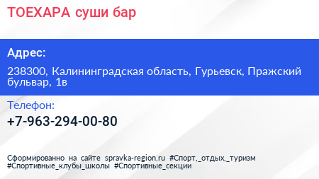 ТОЕХАРА, суши-бар по адресу 238300, Калининградская область, Гурьевск, Пражский бульвар, 1в в дальнейшем Организация, размещена в следующих категориях: