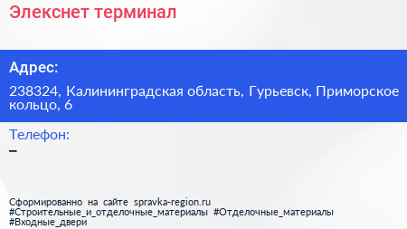 Элекснет, терминал по адресу 238324, Калининградская область, Гурьевск, Приморское кольцо, 6 в дальнейшем Организация, размещена в следующих категориях: