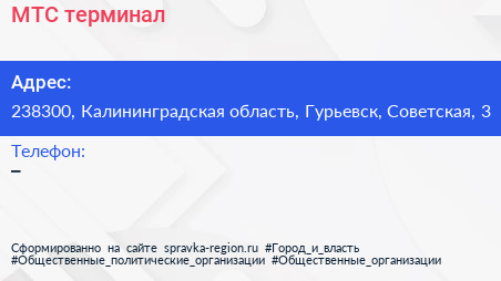 МТС, терминал по адресу 238300, Калининградская область, Гурьевск, Советская, 3 в дальнейшем Организация, размещена в следующих категориях: