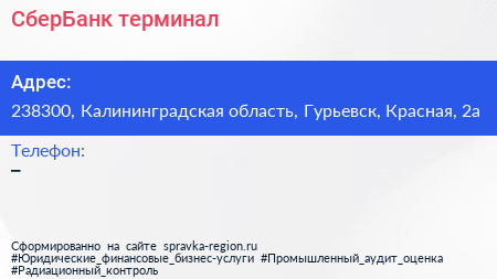СберБанк, терминал по адресу 238300, Калининградская область, Гурьевск, Красная, 2а в дальнейшем Организация, размещена в следующих категориях: