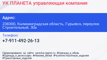 УК ПЛАНЕТА, управляющая компания по адресу 238300, Калининградская область, Гурьевск, переулок Строительный, 30а в дальнейшем Организация, размещена в следующих категориях: