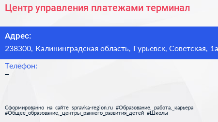 Центр управления платежами, терминал по адресу 238300, Калининградская область, Гурьевск, Советская, 1а в дальнейшем Организация, размещена в следующих категориях: