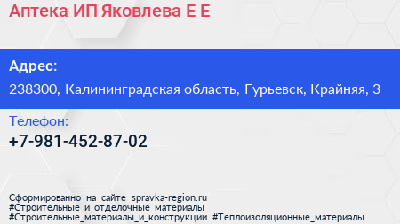 Аптека, ИП Яковлева Е.Е. по адресу 238300, Калининградская область, Гурьевск, Крайняя, 3 в дальнейшем Организация, размещена в следующих категориях: