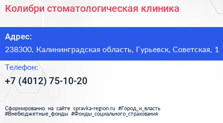 Колибри, стоматологическая клиника по адресу 238300, Калининградская область, Гурьевск, Советская, 1 в дальнейшем Организация, размещена в следующих категориях: