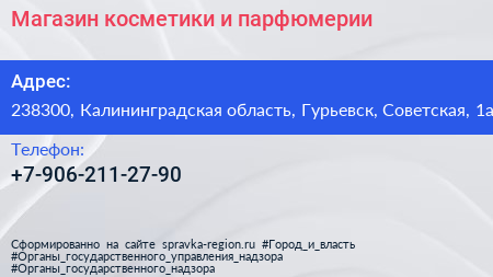 Магазин косметики и парфюмерии по адресу 238300, Калининградская область, Гурьевск, Советская, 1а в дальнейшем Организация, размещена в следующих категориях: