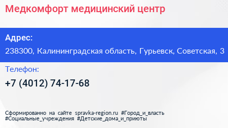 Медкомфорт, медицинский центр по адресу 238300, Калининградская область, Гурьевск, Советская, 3 в дальнейшем Организация, размещена в следующих категориях: