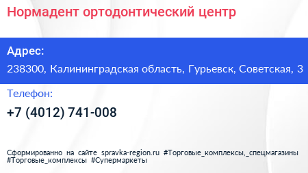 Нормадент, ортодонтический центр по адресу 238300, Калининградская область, Гурьевск, Советская, 3 в дальнейшем Организация, размещена в следующих категориях: