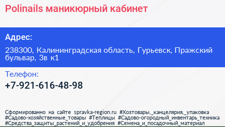 Polinails, маникюрный кабинет по адресу 238300, Калининградская область, Гурьевск, Пражский бульвар, 3в к1 в дальнейшем Организация, размещена в следующих категориях: