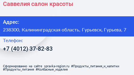 Саввелия, салон красоты по адресу 238300, Калининградская область, Гурьевск, Гурьева, 7 в дальнейшем Организация, размещена в следующих категориях: