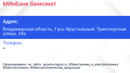 МИнБанк, банкомат по адресу Владимирская область, Гусь-Хрустальный, Транспортная улица, 14а в дальнейшем Организация, размещена в следующих категориях: