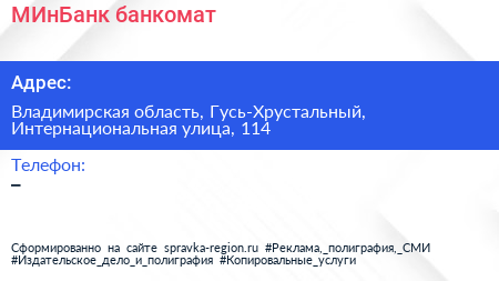 МИнБанк, банкомат по адресу Владимирская область, Гусь-Хрустальный, Интернациональная улица, 114 в дальнейшем Организация, размещена в следующих категориях: