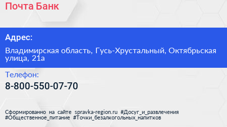 Почта Банк по адресу Владимирская область, Гусь-Хрустальный, Октябрьская улица, 21а в дальнейшем Организация, размещена в следующих категориях: