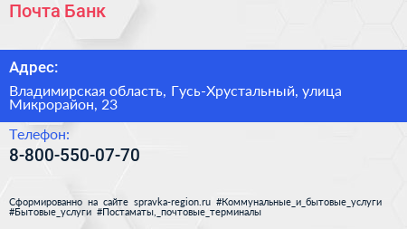 Почта Банк по адресу Владимирская область, Гусь-Хрустальный, улица Микрорайон, 23 в дальнейшем Организация, размещена в следующих категориях: