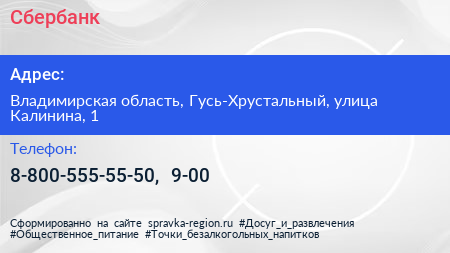 Сбербанк по адресу Владимирская область, Гусь-Хрустальный, улица Калинина, 1 в дальнейшем Организация, размещена в следующих категориях: