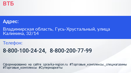 ВТБ по адресу Владимирская область, Гусь-Хрустальный, улица Калинина, 32/14 в дальнейшем Организация, размещена в следующих категориях: