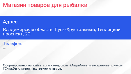 Магазин товаров для рыбалки по адресу Владимирская область, Гусь-Хрустальный, Теплицкий проспект, 20 в дальнейшем Организация, размещена в следующих категориях: