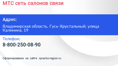МТС, сеть салонов связи по адресу Владимирская область, Гусь-Хрустальный, улица Калинина, 19 в дальнейшем Организация, размещена в следующих категориях: