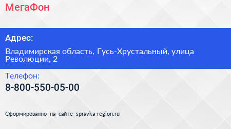 МегаФон по адресу Владимирская область, Гусь-Хрустальный, улица Революции, 2 в дальнейшем Организация, размещена в следующих категориях: