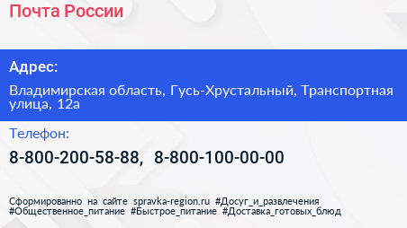 Почта России по адресу Владимирская область, Гусь-Хрустальный, Транспортная улица, 12а в дальнейшем Организация, размещена в следующих категориях:
