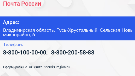 Почта России по адресу Владимирская область, Гусь-Хрустальный, Сельская Новь микрорайон, 6 в дальнейшем Организация, размещена в следующих категориях: