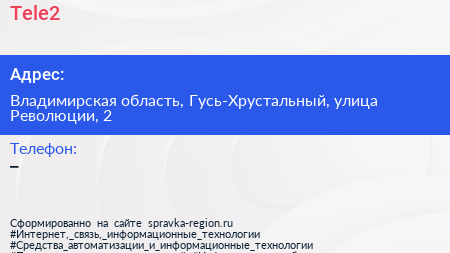Tele2 по адресу Владимирская область, Гусь-Хрустальный, улица Революции, 2 в дальнейшем Организация, размещена в следующих категориях: