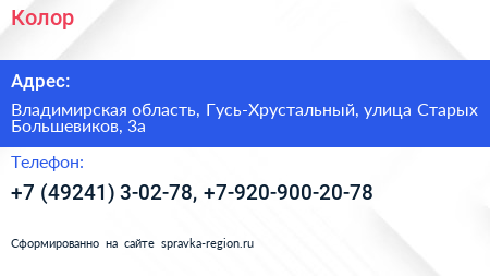 Колор по адресу Владимирская область, Гусь-Хрустальный, улица Старых Большевиков, 3а в дальнейшем Организация, размещена в следующих категориях: