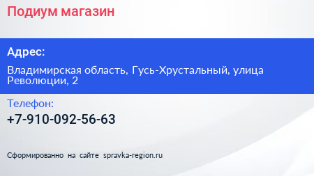 Подиум, магазин по адресу Владимирская область, Гусь-Хрустальный, улица Революции, 2 в дальнейшем Организация, размещена в следующих категориях: