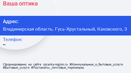 Ваша оптика по адресу Владимирская область, Гусь-Хрустальный, Каховского, 3 в дальнейшем Организация, размещена в следующих категориях: