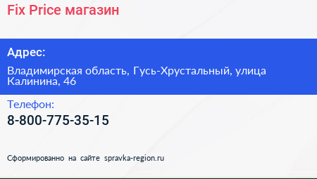 Fix Price, магазин по адресу Владимирская область, Гусь-Хрустальный, улица Калинина, 46 в дальнейшем Организация, размещена в следующих категориях: