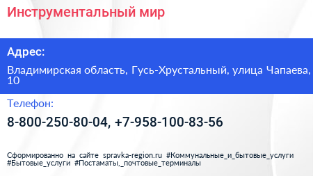 Инструментальный мир по адресу Владимирская область, Гусь-Хрустальный, улица Чапаева, 10 в дальнейшем Организация, размещена в следующих категориях: