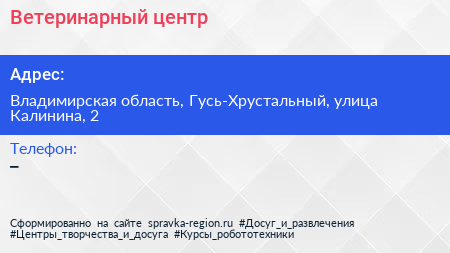 Ветеринарный центр по адресу Владимирская область, Гусь-Хрустальный, улица Калинина, 2 в дальнейшем Организация, размещена в следующих категориях: