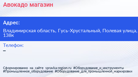 Авокадо, магазин по адресу Владимирская область, Гусь-Хрустальный, Полевая улица, 138к в дальнейшем Организация, размещена в следующих категориях: