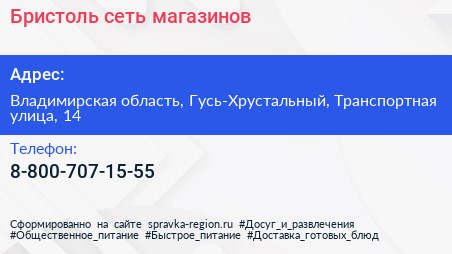 Бристоль, сеть магазинов по адресу Владимирская область, Гусь-Хрустальный, Транспортная улица, 14 в дальнейшем Организация, размещена в следующих категориях: