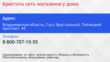 Бристоль, сеть магазинов у дома по адресу Владимирская область, Гусь-Хрустальный, Теплицкий проспект, 44 в дальнейшем Организация, размещена в следующих категориях: