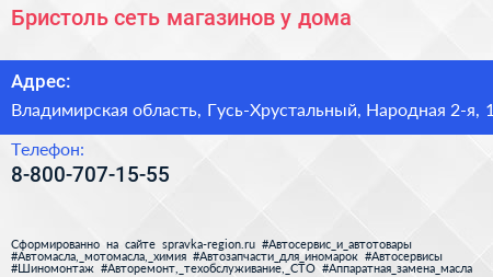 Бристоль, сеть магазинов у дома по адресу Владимирская область, Гусь-Хрустальный, Народная 2-я, 1 в дальнейшем Организация, размещена в следующих категориях: