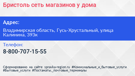 Бристоль, сеть магазинов у дома по адресу Владимирская область, Гусь-Хрустальный, улица Калинина, 393к в дальнейшем Организация, размещена в следующих категориях: