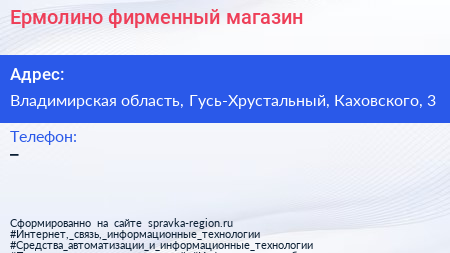 Ермолино, фирменный магазин по адресу Владимирская область, Гусь-Хрустальный, Каховского, 3 в дальнейшем Организация, размещена в следующих категориях: